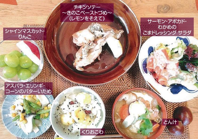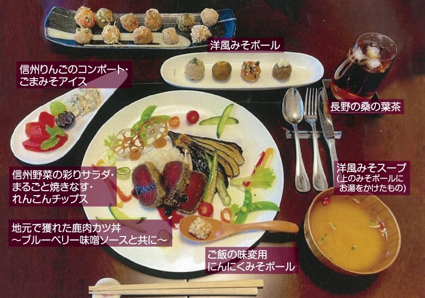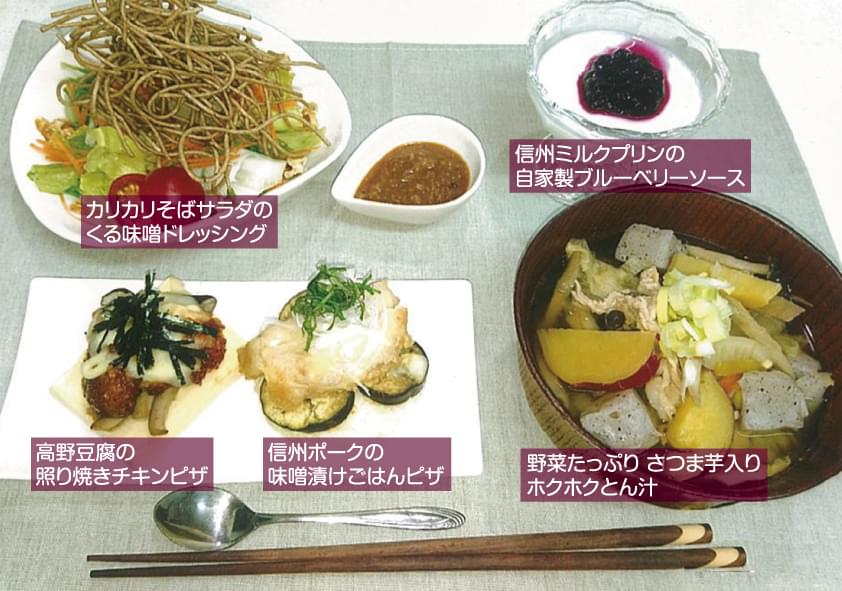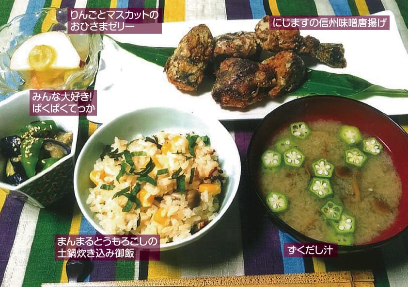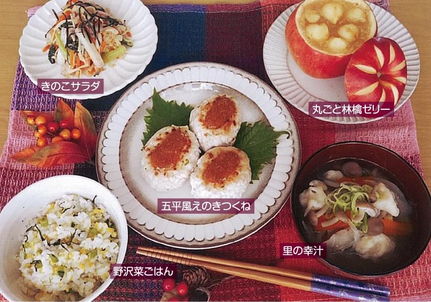 信州の食材をたくさん使っていて、全体的にとても栄養価の高い献立になっていると思います。信州名物の五平餅のアレンジレシピでは鶏ひき肉とエノキを用いてメイン料理に仕立て、なおかつ食感もプラスされた素晴らしいアイデア料理になっています。